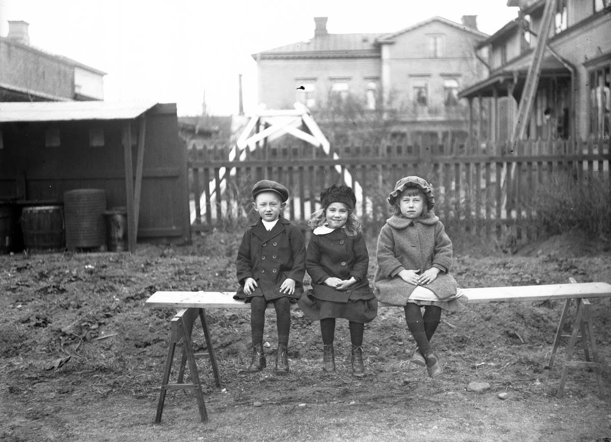 Två flickor och en pojk ute på gårdsplanen