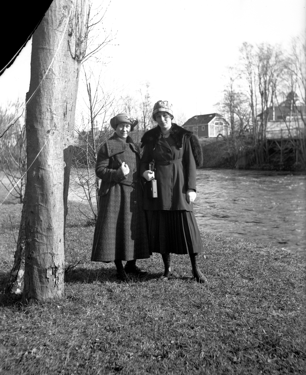 Två unga kvinnor vid Gavleån i Stadsträdgården