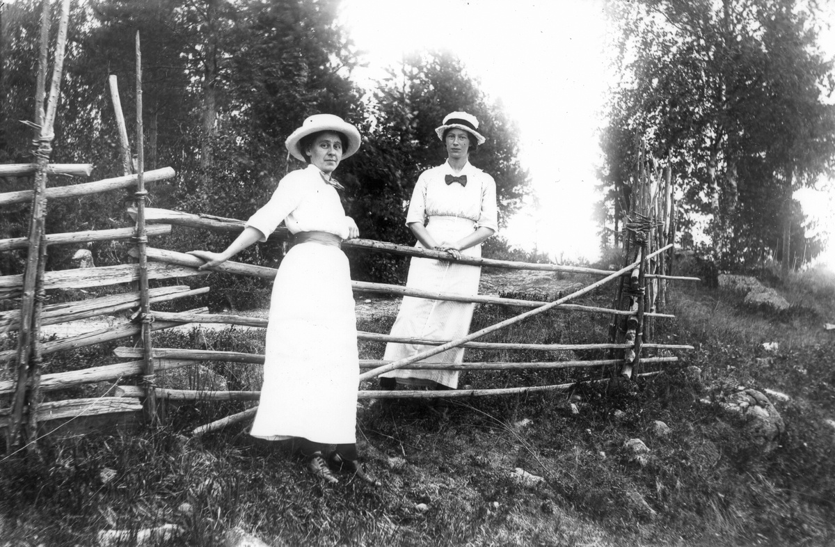 Till vänster Hilda, gift med Stor-Pelles Per Eriksson. Hon var piga på herrgården. Kvinnan till höger okänd.
