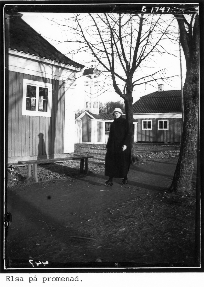 Elsa på promenad vid entrén till Folkungavallens idrottsplats, Brunnsgatan, Nyköping.