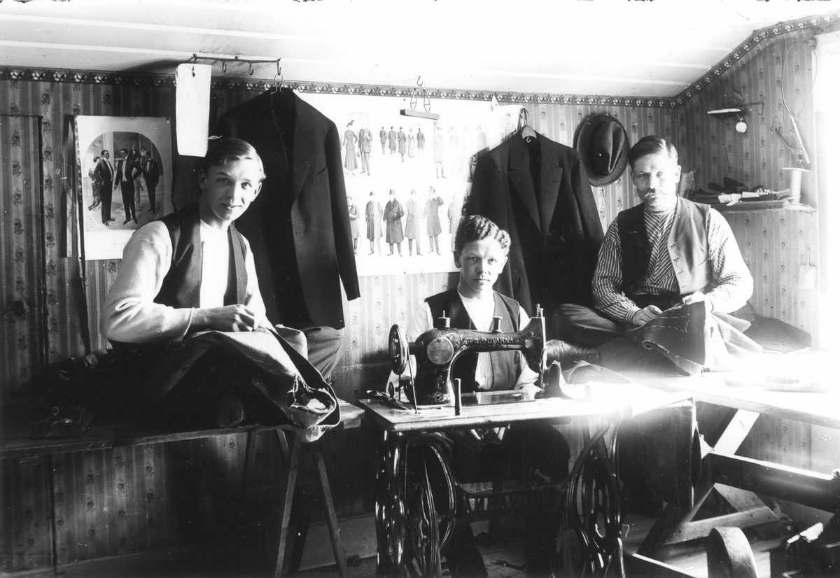 Interiör från Söderbergs skrädderi på vindsvåningen i Skräddars. Från vänster: Verner Söderberg, Martin Söderberg och Jonas Olsson.