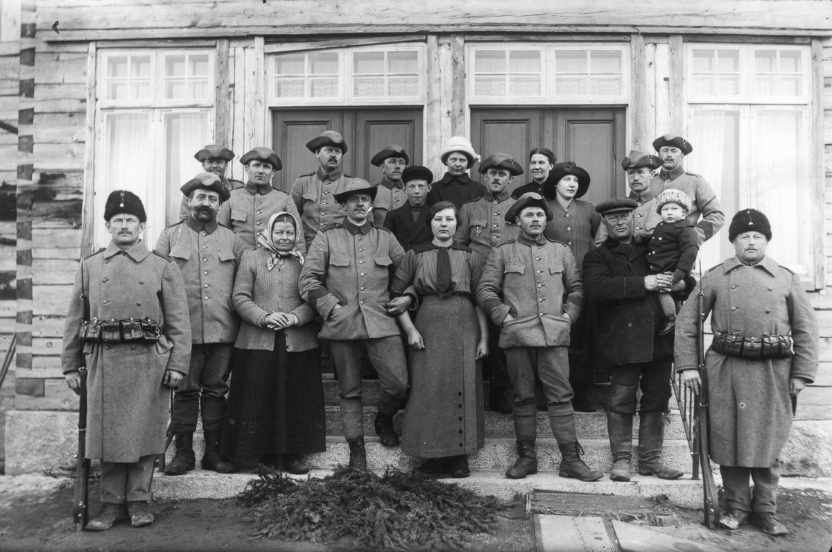 Utanför Skinnars, Lenninge 6:14. De civila i främre raden från vänster: Marta Hansson, "Blank-Karin" från Böle, Per Hansson med dottersonen Jonas Persson. I bakre raden från vänster: Evert Svedlund, Brita Persson, Ella Olsson (syster till Per) och Edla Olsson. Militärerna okända.