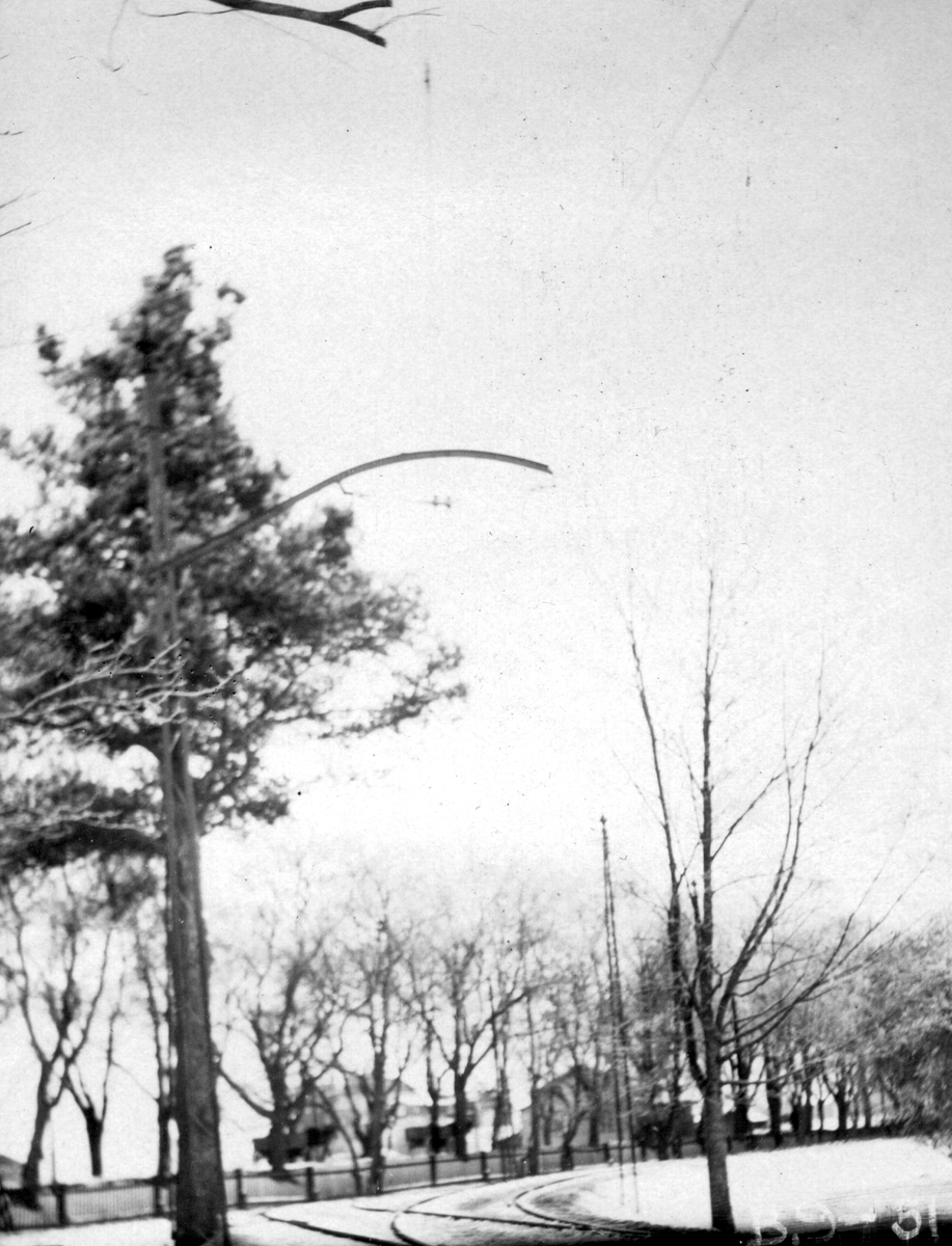 Vid vändslingan i Stadsträdgården med luftledningsstolpe. Växel till uppställningsspår i bakgrunden.