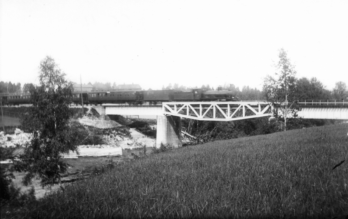 Ångdrivet snälltåg över järnvägsbron i Lenninge.