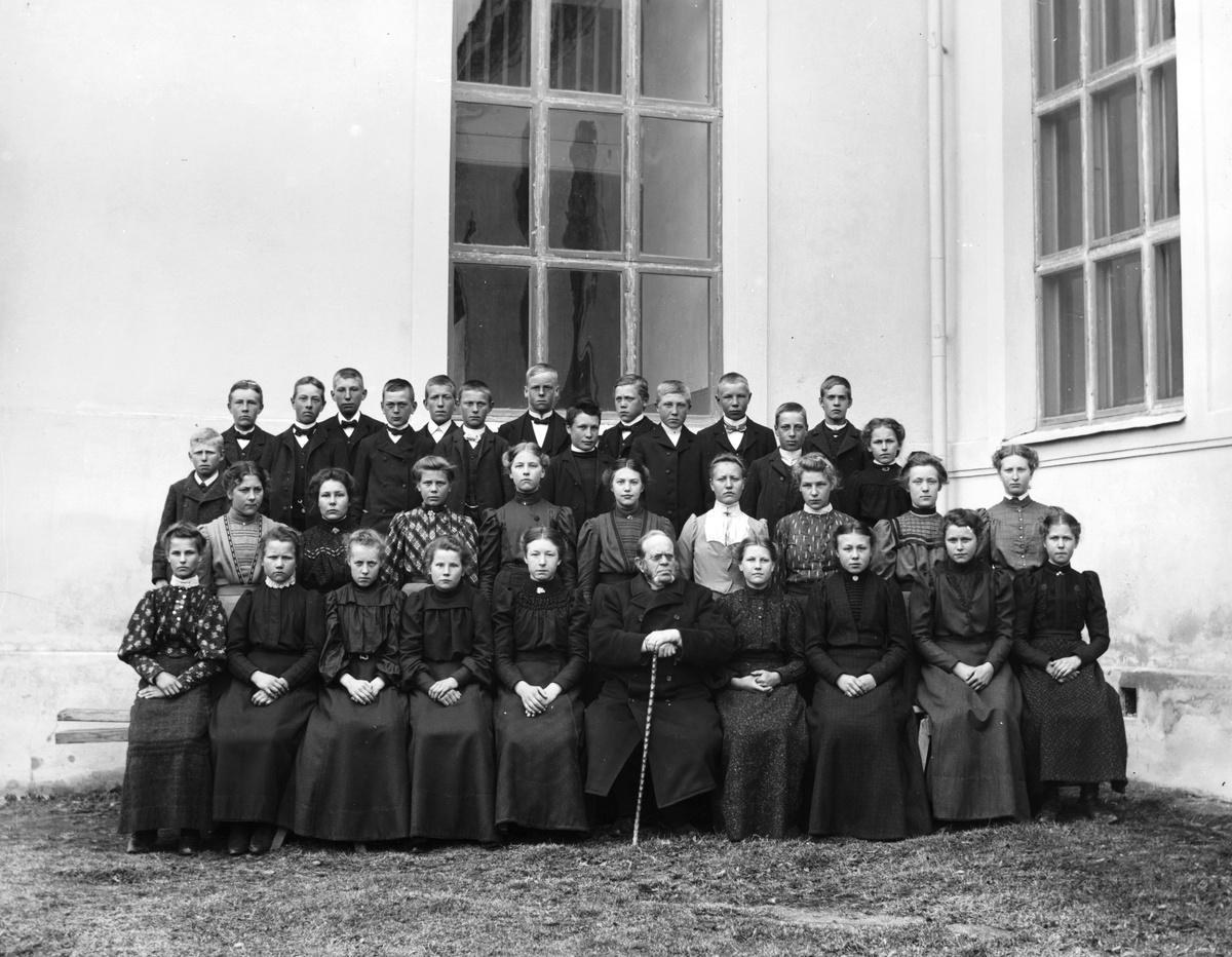 Läsbarn i Skog med kyrkoherde Samelius utanför Skogs kyrka.