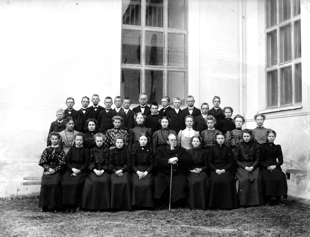 Läsbarn i Skog med kyrkoherde Samelius utanför Skogs kyrka.