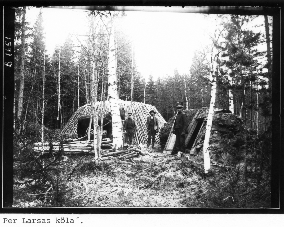 Per Larsas köla´, kolmila och kolarkoja. Från vänster: ej känd person, Per Larsson, Kvarnåsen, och Lars Ersson, Sörsidan.