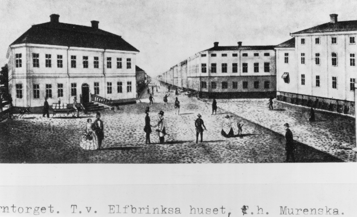 Järntorget (ungefär där Drottninggatan nu möter Centralplan) med Drottninggatan mot väster. Till vänster kommunalrådet Elfbrinks hus, till höger Murenska huset. De förstördes vid stadsbranden 1869.