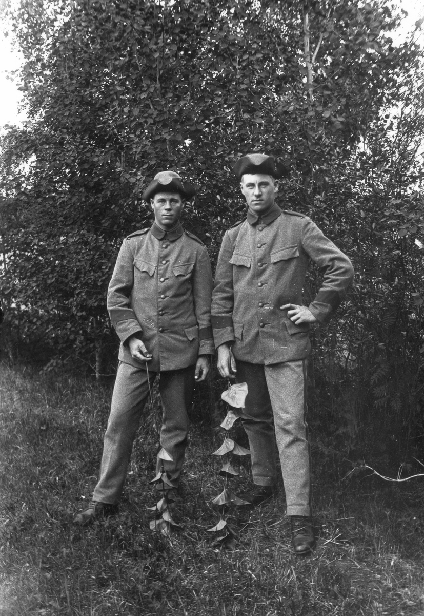 Två okända soldater. Militärer var förlagda till Lenninge under första världskriget för att bevaka broarna över älven.