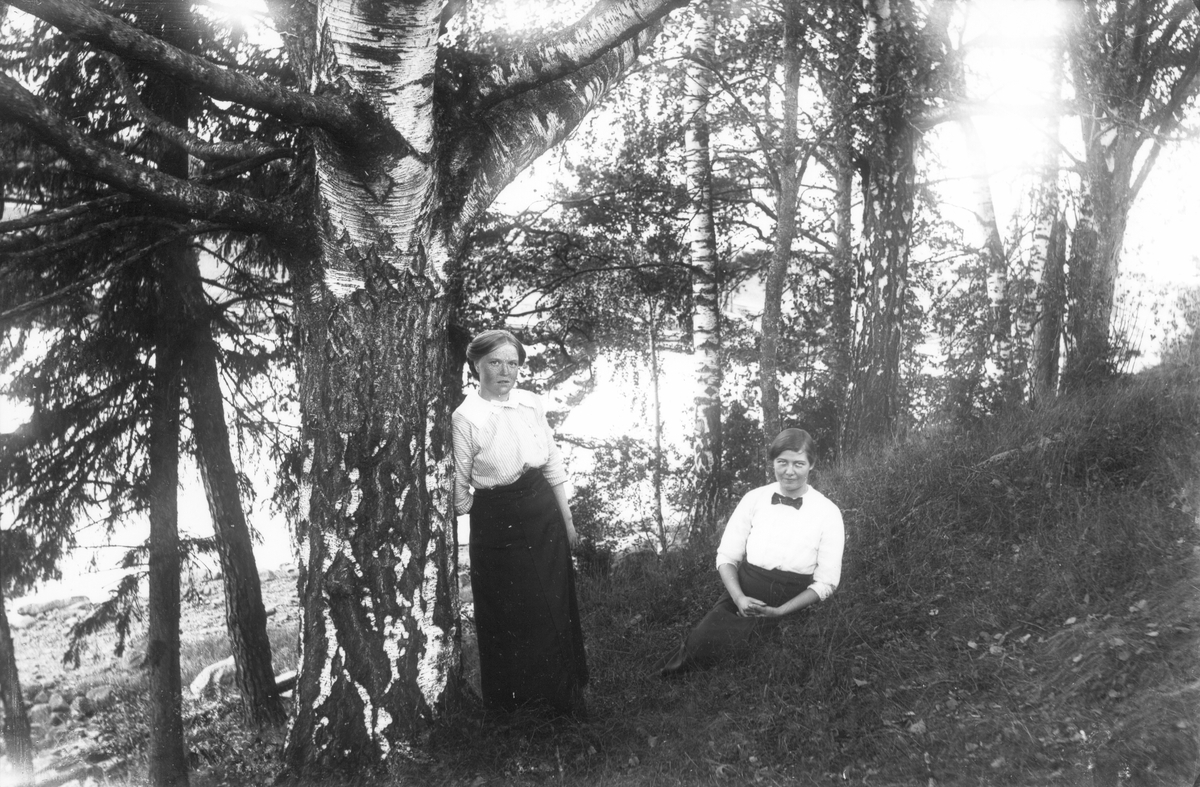 Till vänster "Stina på Näset", Stina Nilsson, född 1896, förr Voxsätter 1, nu Voxsätter 14:1, till höger Brita Persson, född 1894, Lenninge 6:14.