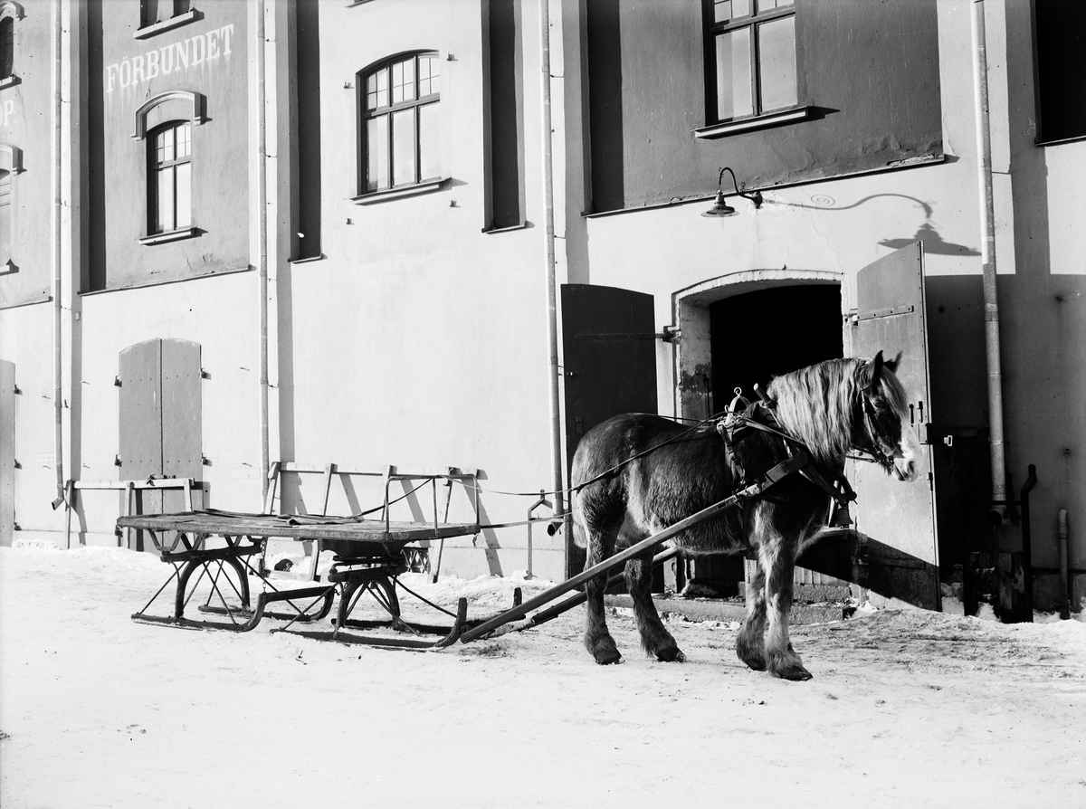 Häst och släde framför Kooperativa Förbundets lager och kontor