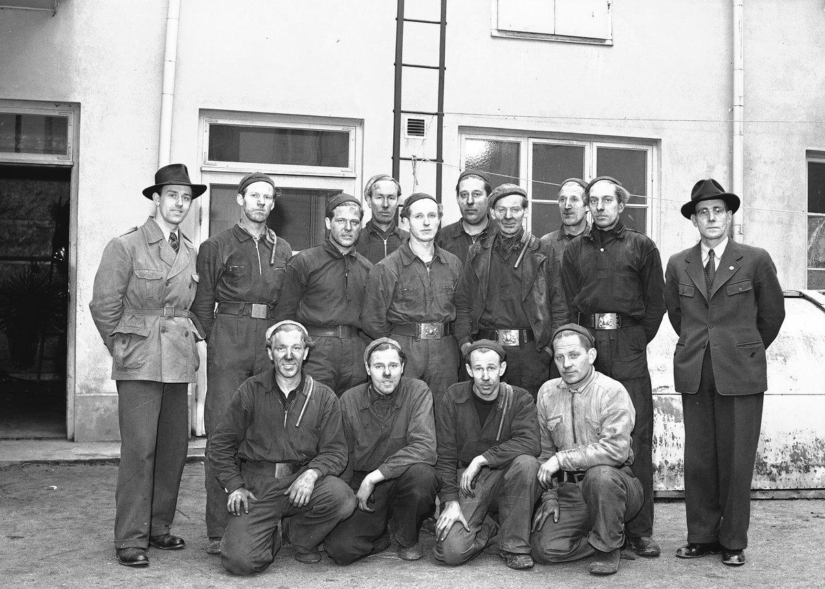 Gruppbild av sotare. Sotaren som sitter längst till vänster "Oa" Löfstedt. Tredje från vänster i främre raden är Gert Rung (f. 1917). Foto taget den 11 december 1946.