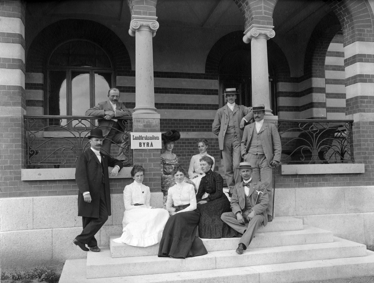 En grupp personer på trappan till Staketgatan 15, vid Gävleutställningen 1901.