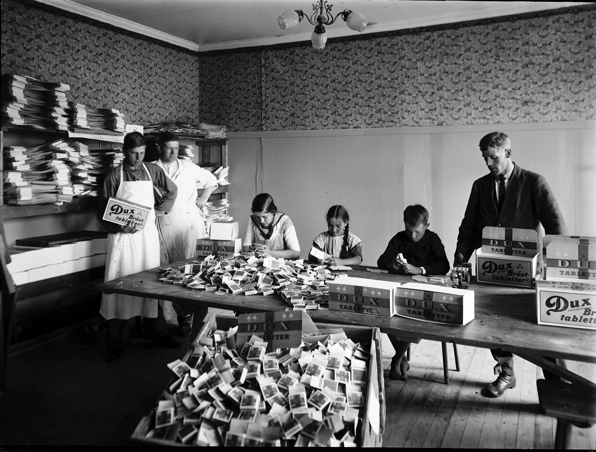 Under 1800-talet var barnarbete vanligt i Sverige. Barnen var billig arbetskraft. Deras lön var liten. Den skulle inte räckt till att försörja dem själva. Deras uppgifter var enkla men monotona, det var lättare att motivera barn än vuxna till arbetet. Här viker barn vid DUX karamellfabrik askar för brösttabletter. Under 1900-talet blev barnarbete ovanligare i takt med att fabrikerna mekaniserades. De enkla momenten försvann, en barn- och ungdoms- arbetslöshet uppstod. Samtidigt stiftades lagar för att reglera barnarbete. Dux-fabriken hade sitt ursprung i Srömsbro av Gustav Ferngren i början av 1900-talet. Flyttade på 1920-talet till Hamntorget och sedan till Tredje Tvärgatan 23 på Brynäs. Firman hade upphört 1930. Tidigare publicerad vid utställningen år 2000.