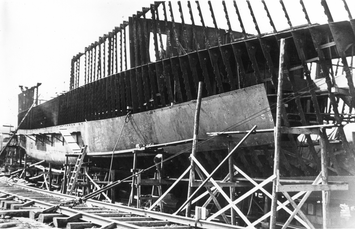 Uppsättning av bordläggningsplåtar, vid Gävle Varv.