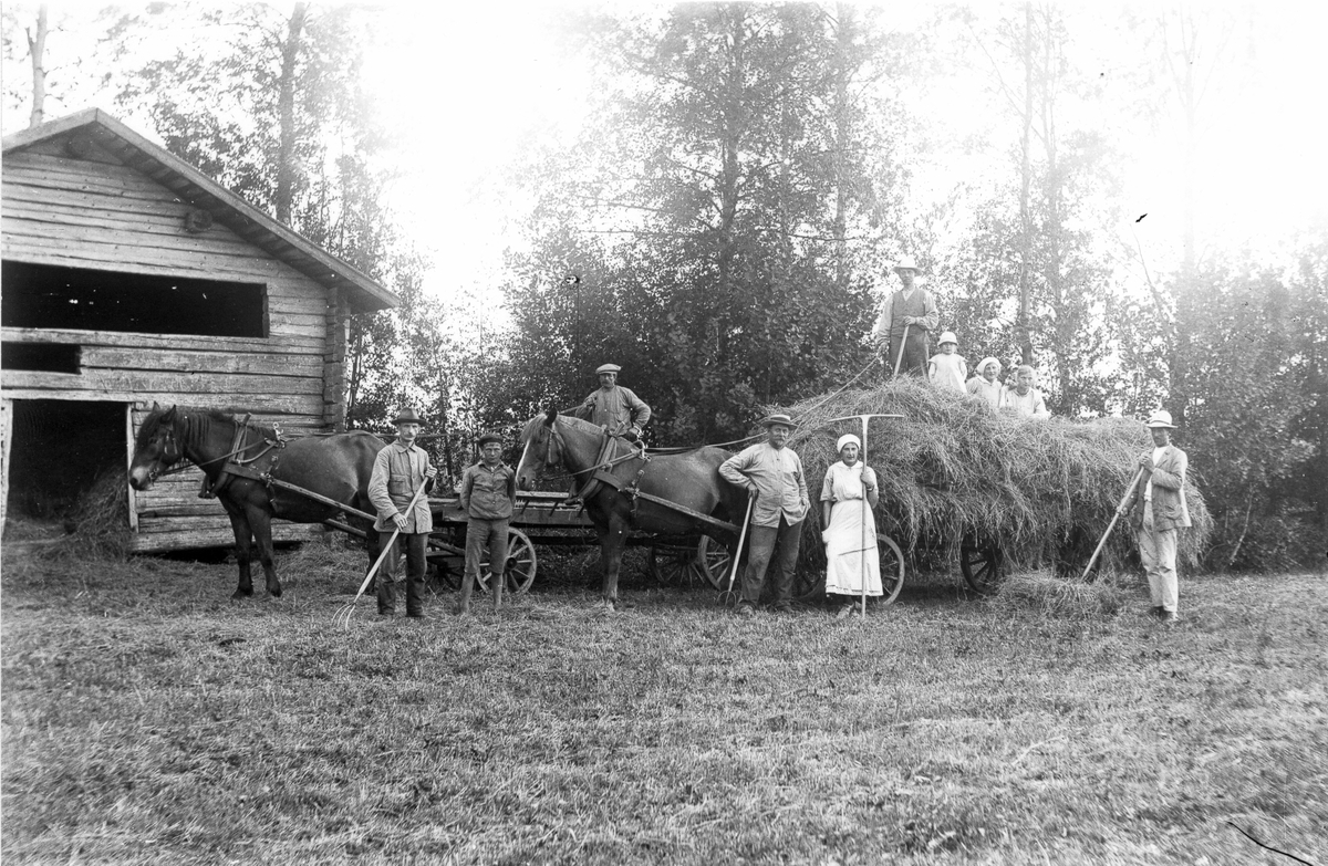 Slåtterarbete i trakten av Lenninge. Personerna okända.