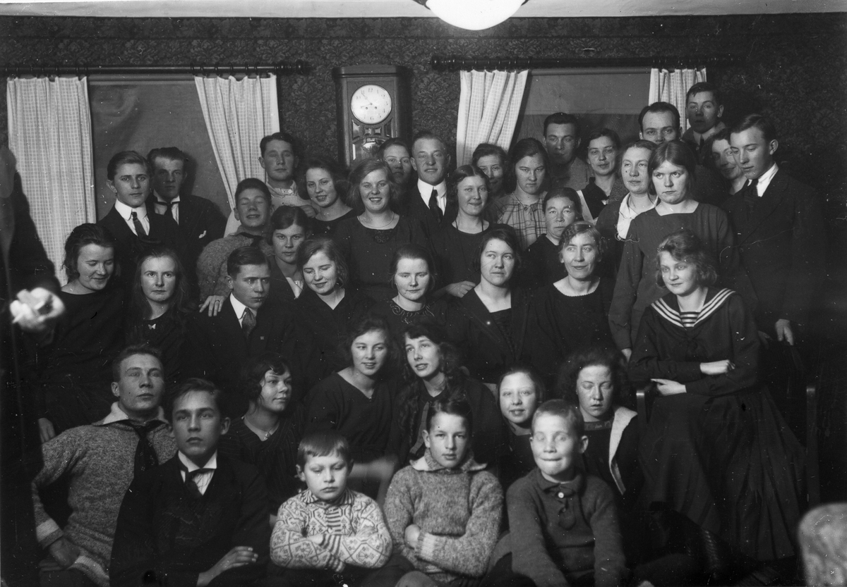 Främre raden från vänster: Skräddar-Martin (Söderberg), Skinnar-Jonas (Persson), Viktor Granlund (skogvaktarns) och Martin Jansson (kuskens). Andra raden från vänster: Kattnäs-Karl (Olsson), Fäll-Abrahams Anna (Jonsson), Agda Granlund, Tora Söderberg, Sally Mattsson (piga i Per-Jöns), Jumblas-Anna (Eriksson). Tredje raden från vänster: Målar-Ebba (Wikström), Smehammar-Elin (Larsson), Einar Lönn, Britta Jansson, Smehammar-Anna (Larsson), Ester Englund, okänd och en syster till Naima (Mjölnar-Olles fru). Fjärde raden från vänster: Verner Hall, Nils på Näset (Nilsson), Kattnäs-Axel, Kattnäs-Elis, Trädgårds-Tilda (Eriksson), Märta på Näset (Nilsson), okänd, Petrus på Näset (Nilsson), Sara Ek, okänd, Nils-Nils Stina (Nilsson), Östbergs-Emma, Nils-Nils Nils (Johansson), Mjölnar-Naima (Olsson), Mjölnar-Olle (Olsson), Nisse Styf, okänd, Nils-Nils Lars (Johansson). Bilden tagen omkring 1922.