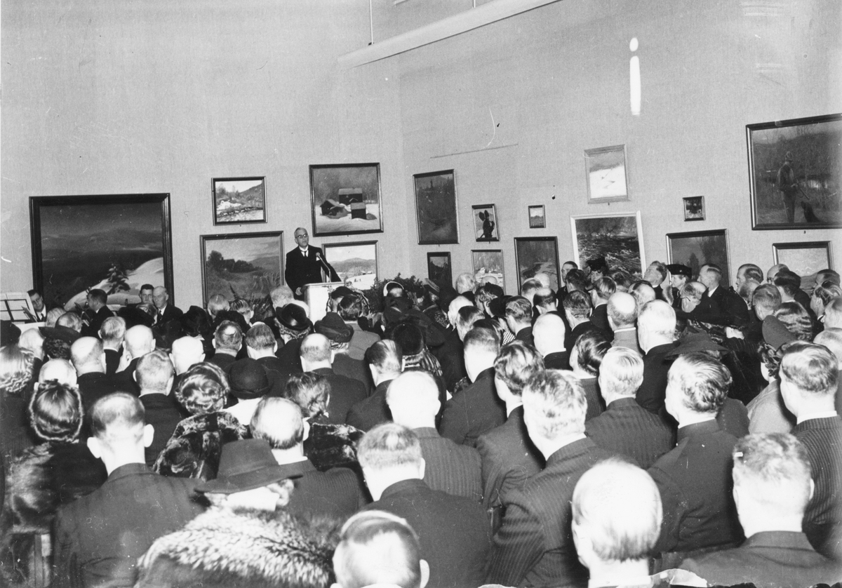 Byggnadskommitténs ordförande, borgmästare Nils Berlin överlämnar Gävle Museum i stadsfullmäktiges vård vid invigningen 29 september 1940.
