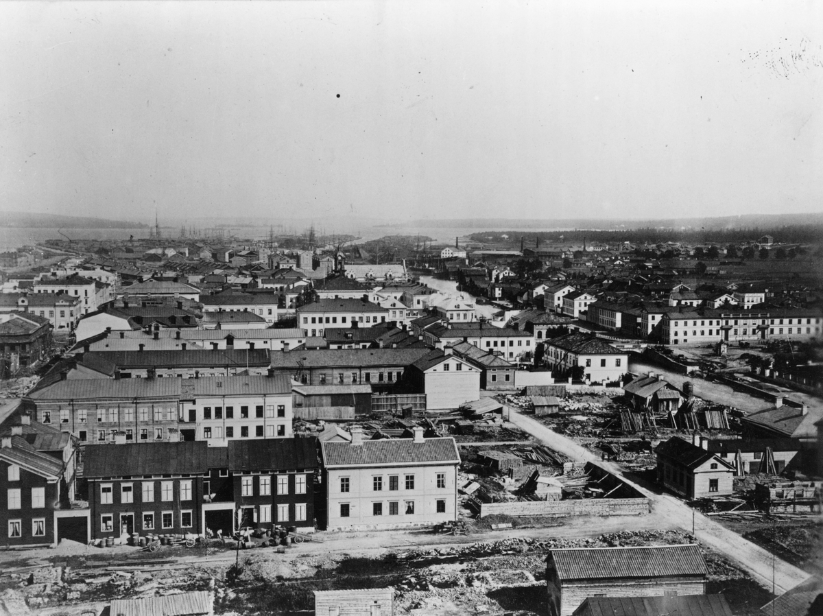 Utsikt från kyrktornet österut. Återuppbyggnad efter branden 1869.