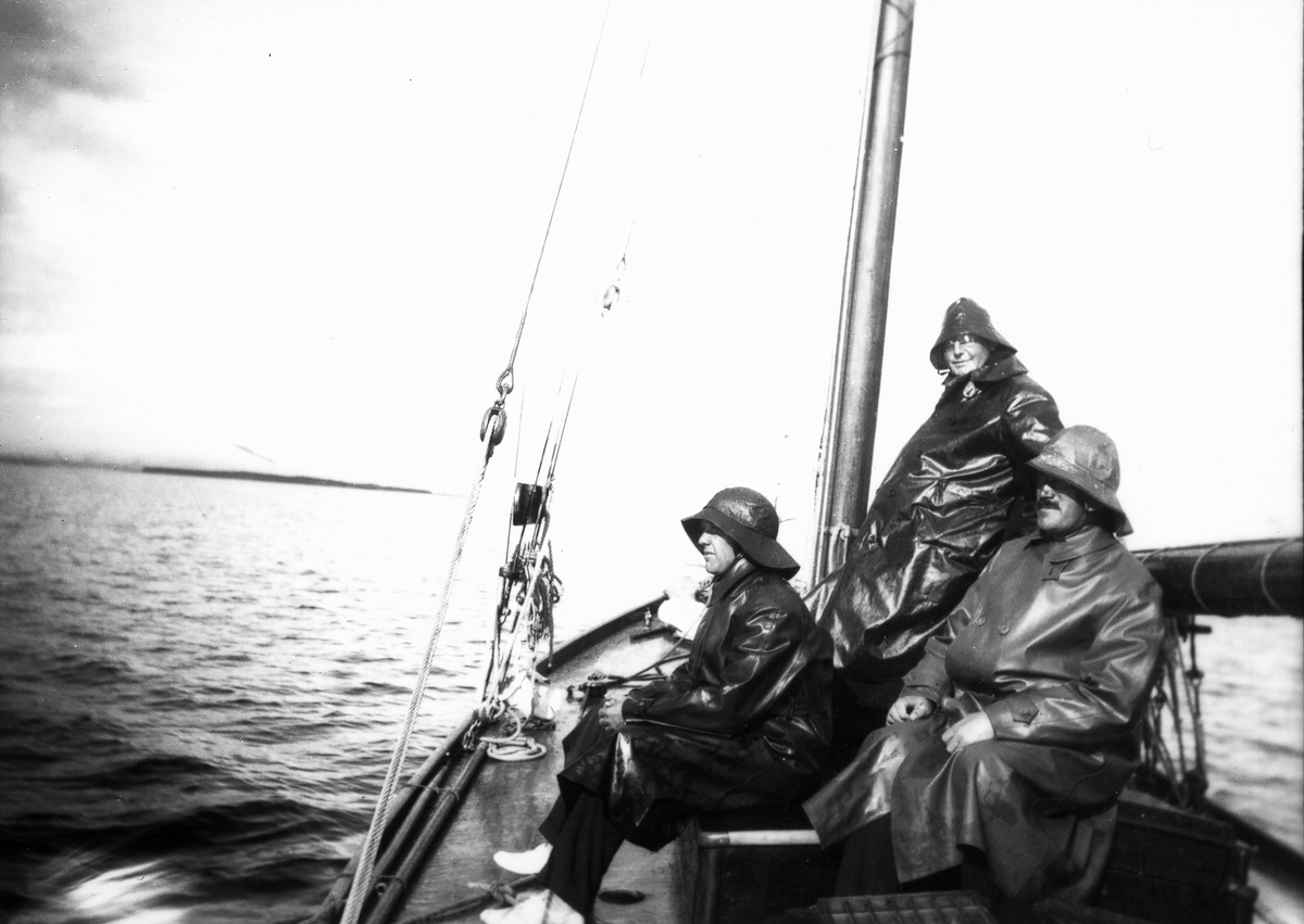 S/y "Ingvor". Tre män väntar på bättre väder.