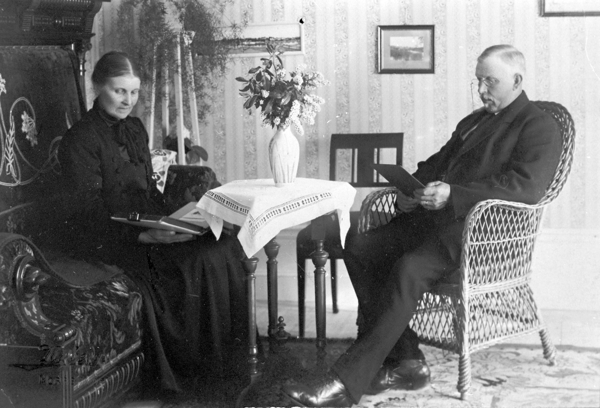 Sofia sittande i soffan och Jöns Wilander i korgstol i deras hem i Hamrånge.