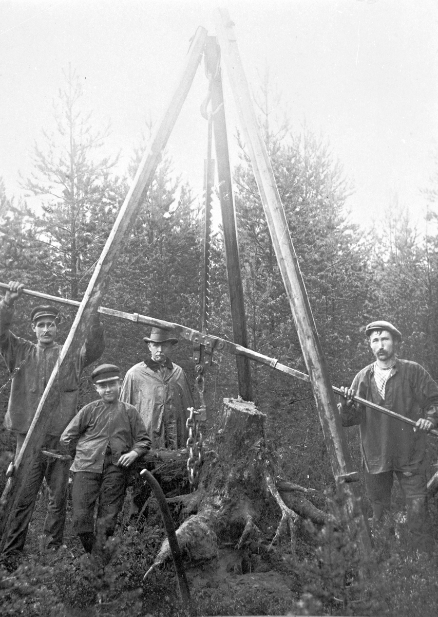Stubbrytning. Tillsammans med Gunnar Lindqvist och Per Åberg startade Jöns Wilander en tjärfabrik i Hagsta, Hamrånge. Jöns Wilander är mannen i hatt.