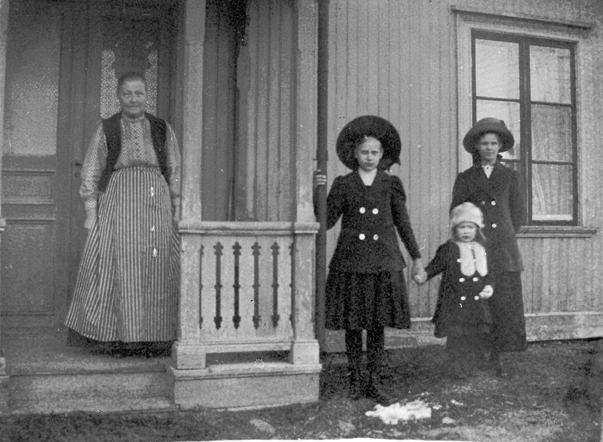 Kvinna på förstukvist vid okänt hus. Anna Sofia Wilander håller en liten flicka i handen. Systern Astrid Elisabet längst till höger.