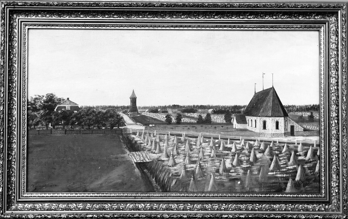 Tavla av Hamrånge gamla kyrka, målad ur minnet av hemmansägare Olof Lindkvist, 1914. Finns i Hamrånge kyrka, dit den skänkts av riksdagsman Erik Westin, Hagsta.