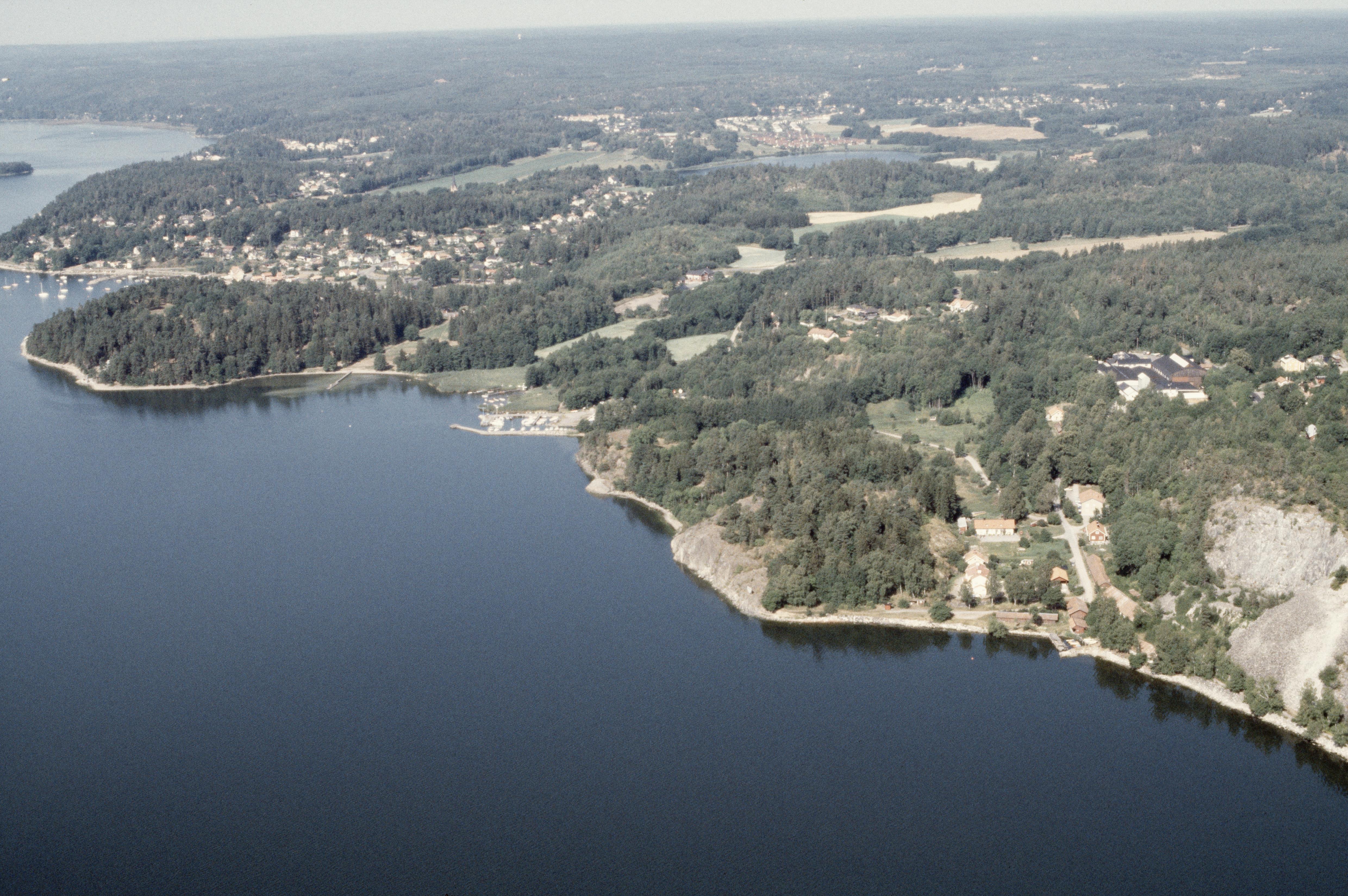Bodaviken i Bråviken. Östra delen av tätorten Uppe till vänster boplats RAÄnr Krokek 1:1 m.fl. vid Fagervik och Marmorbruket. I bildens övre del Kolmården. Bilden är tagen mot (väderstreck): VNV