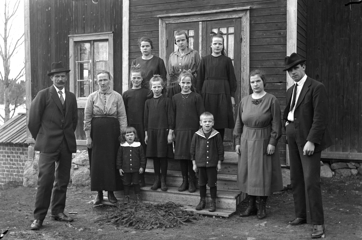 Murare A. W. Alm med familj. Från vänster Anders Wilhelm Alm f. 28 november 1875 d. 24 maj 1952, Karin Östlund-Alm f. 4 december 1876 d. 14 juli 1935. Överst på trappan Linnea f. 22 september 1906, Karin f. 18 oktober 1908, Nancy f. 12 mars 1908. Nedanför Stina f. 10 april 1910 (tvilling), Märta f. 15 oktober 1911, Brita f. 10 april 1910 (tvilling). Bredvid trappan Frida f. 7 april 1902, August f. 2 juli 1900. nederst på trappan Göran f. 15 september 1918, Sune f. 23 mars 1916.