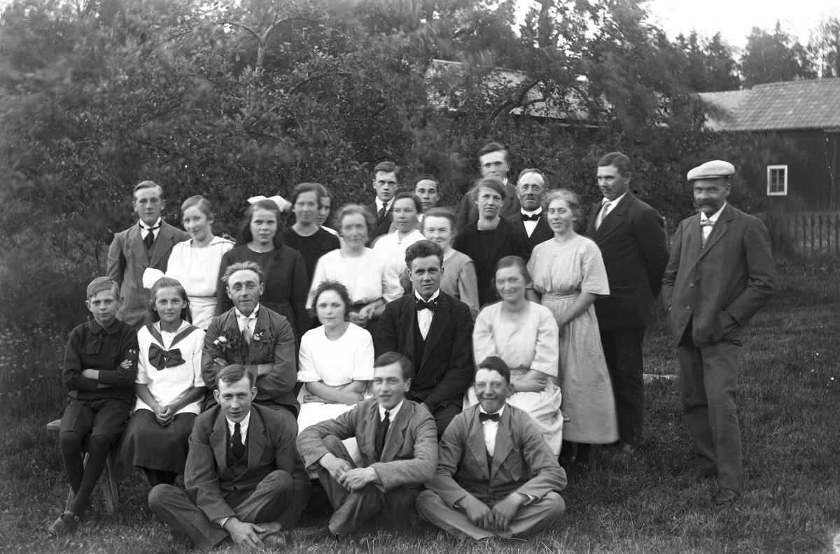 Sittandes på gräsmattan från vänster okänd, Axel Larsson Wij, okänd. Bänkraden från vänster Nore Englund Fors, okänd, Artur Eriksson, okänd, Ejnar Lasrsson, okänd. Stående från vänster Gustav Englund Fors, okänd, okänd, Ester Eriksson, Märta Eriksson, Elsa Eriksson, Joel Hansson, Anna Eriksson, Joel Eriksson, Annie Larsson, Anna Lundgren Prästhyttan, Bertil Hansson, Sixten Olsson, Svea Eriksson, John Eriksson, Karl-Olof Eriksson "Skommar-Kalle".