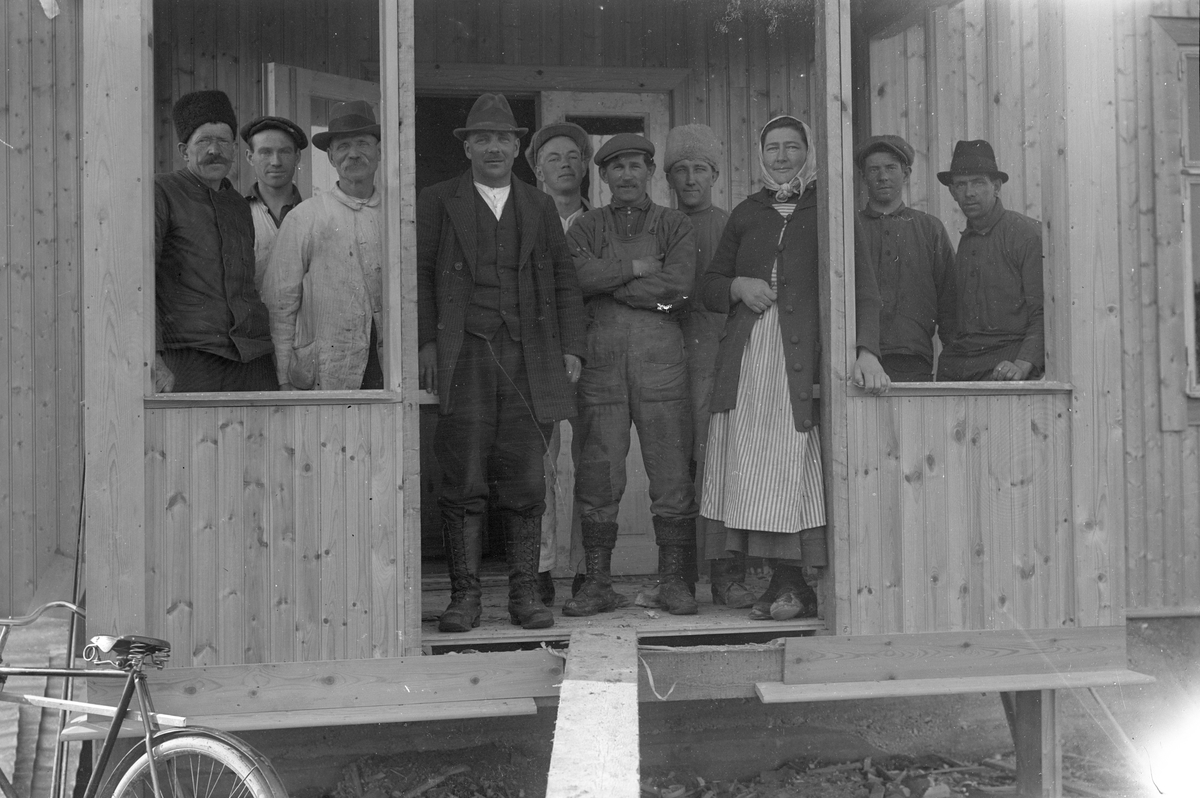 Elin och Leanders nybygge på "Hindriks", Åsen, omkring 1921-22. Fjärde man från vänster Leander Johansson den enda kvinnan är Elin Johansson. De övriga är murare och byggnadsarbetare