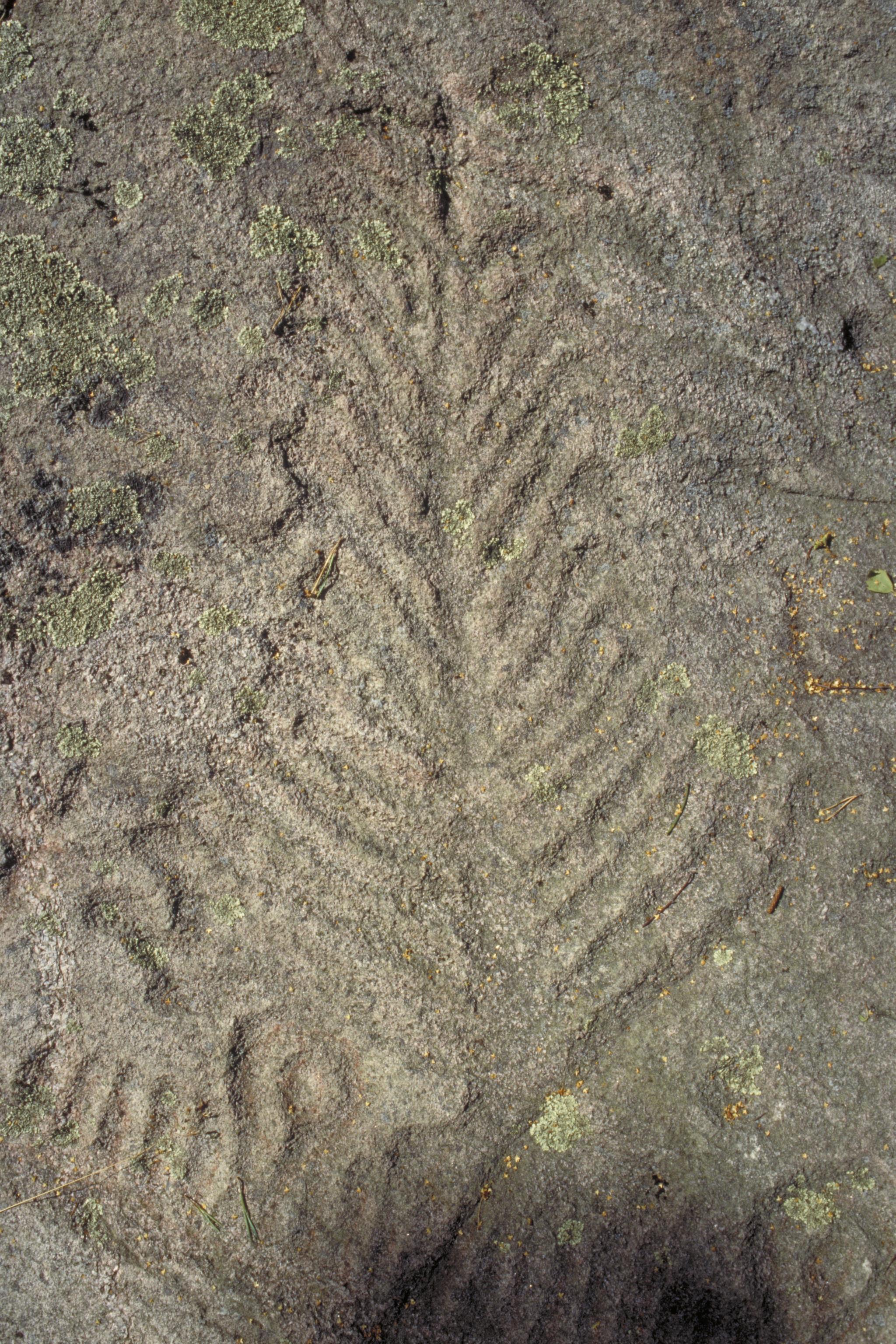 Hällen en sen sommarkväll/natt. En gran eller ormbunksblad, och ett skepp.