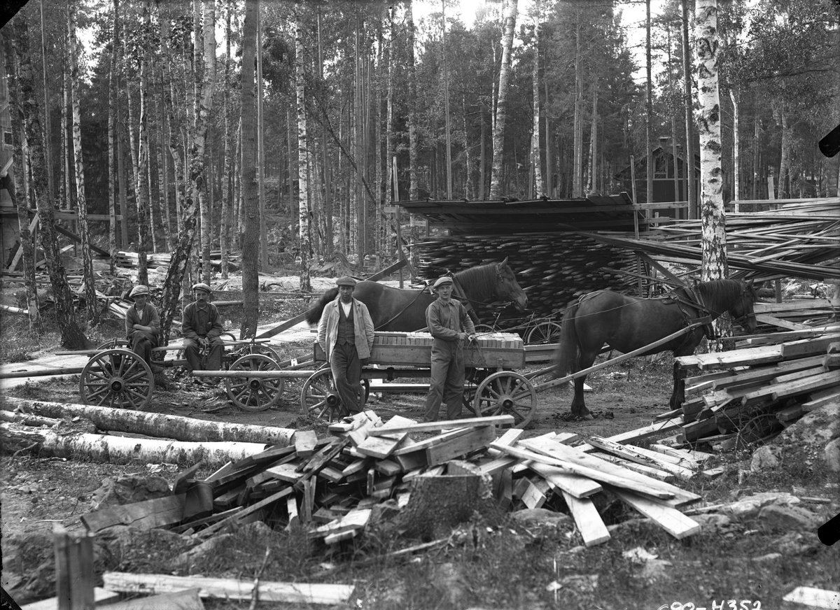 Timmerkörning, fyra män och två hästar.