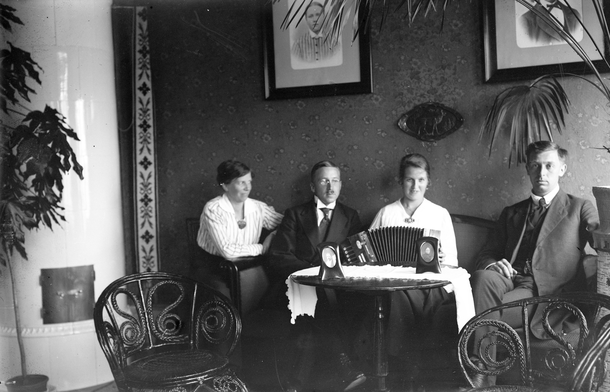 Fyra personer i soffan vid kakelugnen. Torsåkertrakten.