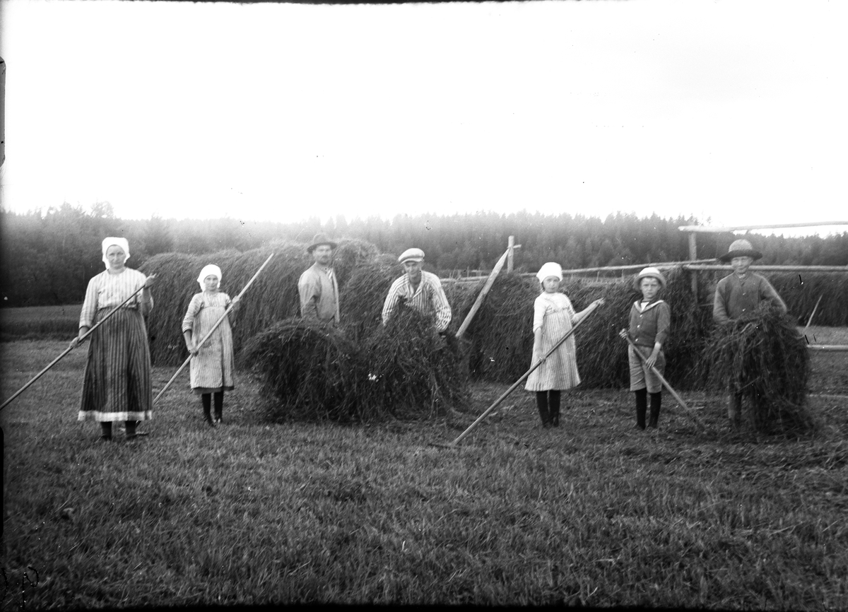 Slåtter. Elin Svedberg, okänd, Per Svedberg, Nils Svedberg, okänd, okänd, okänd.