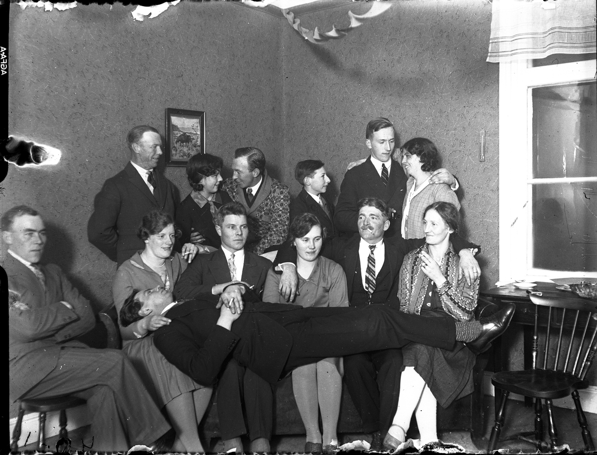 Till vänster i bakre raden Erik B Eriksson, därefter två okända, Ehrling Andersson, Rimsbo, okänd, Agnes Andersson. Främre raden från vänster okänd, Hilda Eriksson, två okända, "Jönsbo-Nils" och Beda Jonsson, Jönsbo.