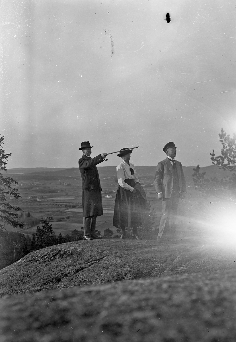 Titel: Från vänster Helmer Norling, okänd kvinna och Herman Norling vid Klocksberg i Torsåker.