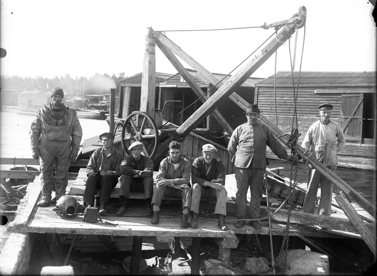 Dykarlag vid lastpråmar, hamnen i Norrsundet.