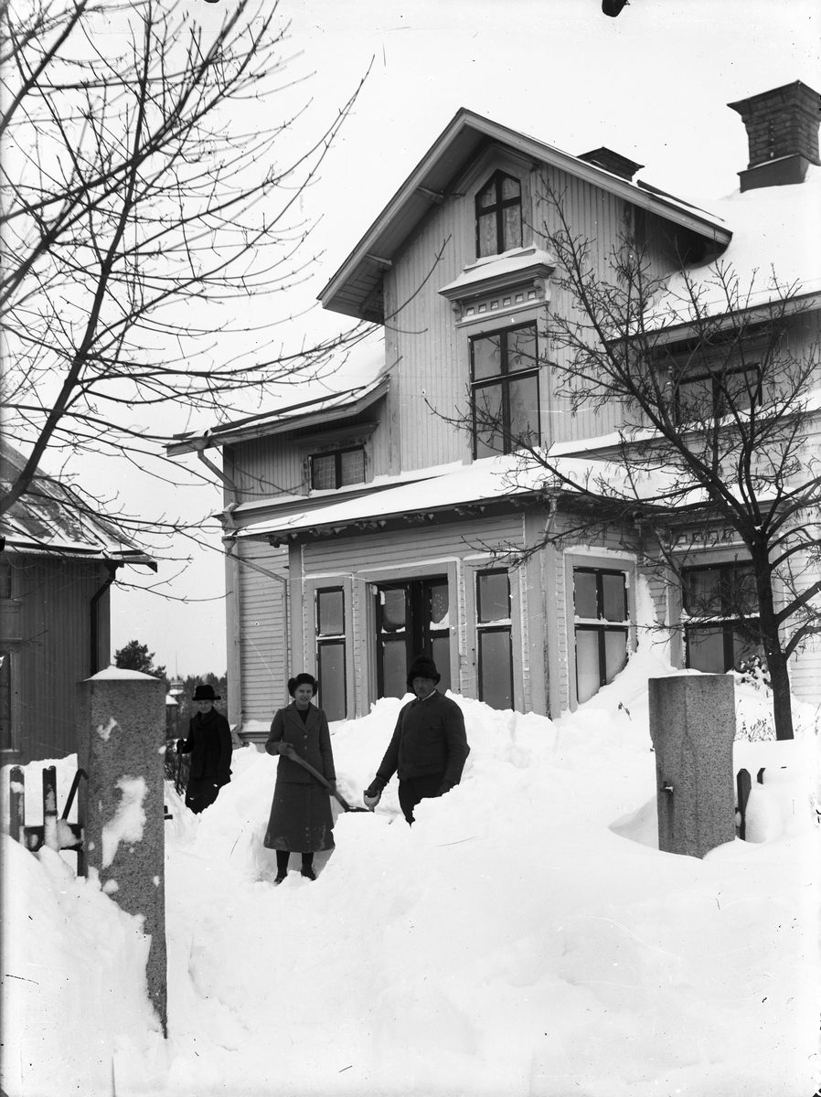 Jöns Wilander och dottern Anna Sofia skottar snö framför huset på Kvistholmsvägen i Norrsundet. Hustrun Sofia står till vänster.