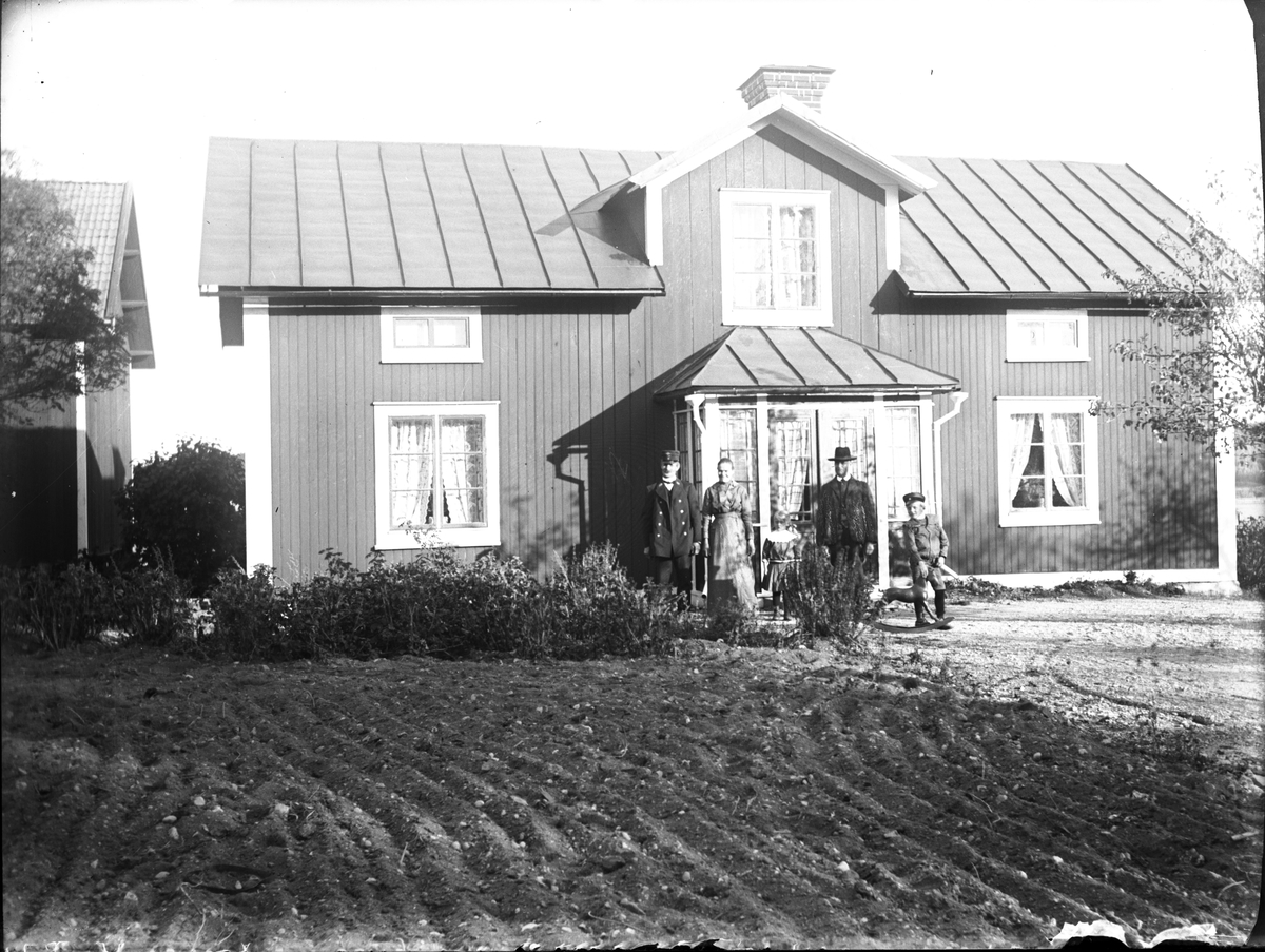 Hodéns gård, Väster Hästbo nummer 2:6. Från vänster Karl Hodén, Johanna Hodén, dotter Tyra, Johannas far från Möklinta och sonen Gunnar.
