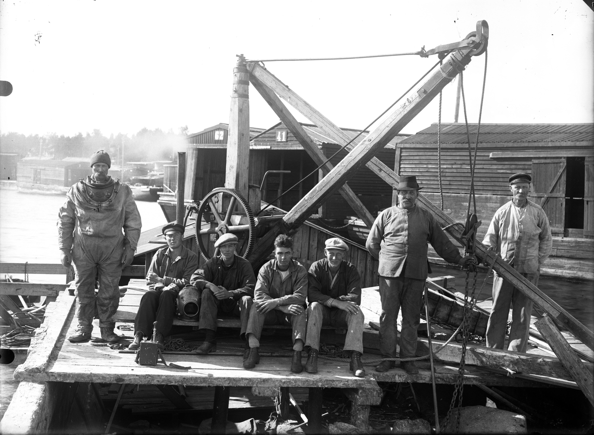 Dykarlag vid lastpråmar, hamnen i Norrsundet.