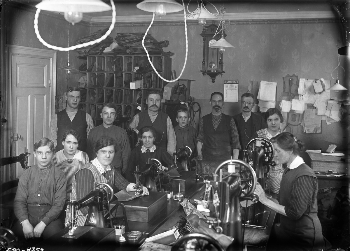 Gruppbild, interiör från skrädderi.