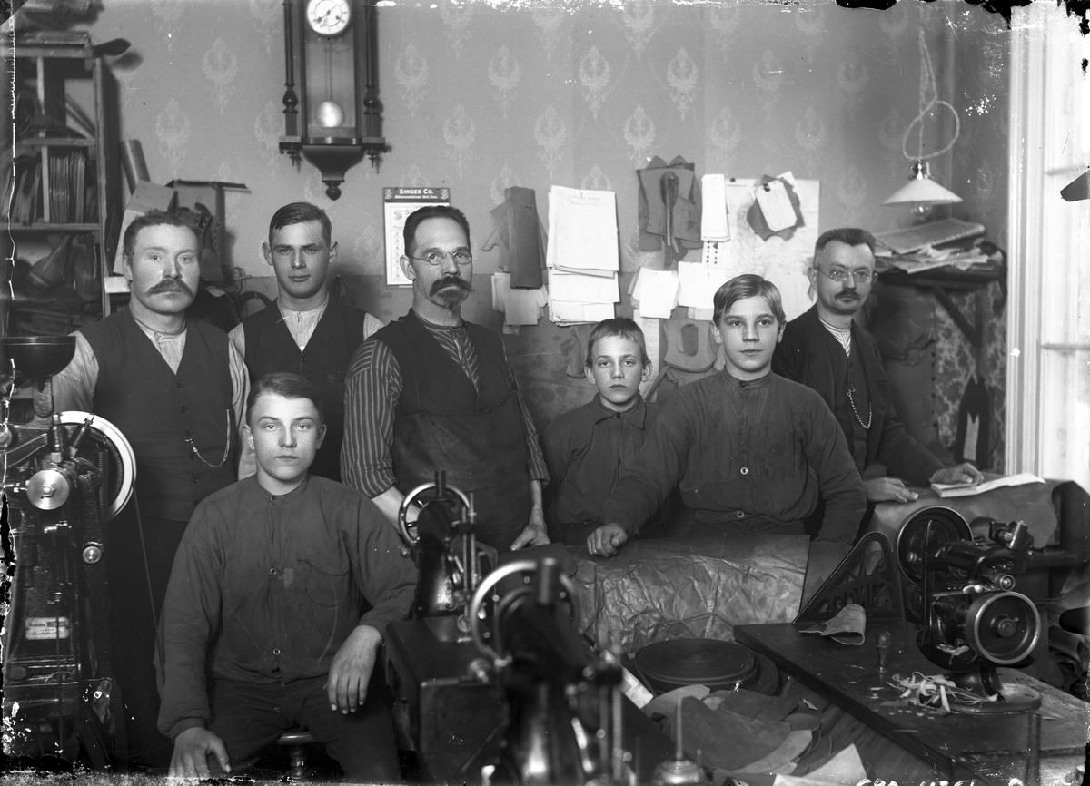Gruppbild, interiör från skrädderi.