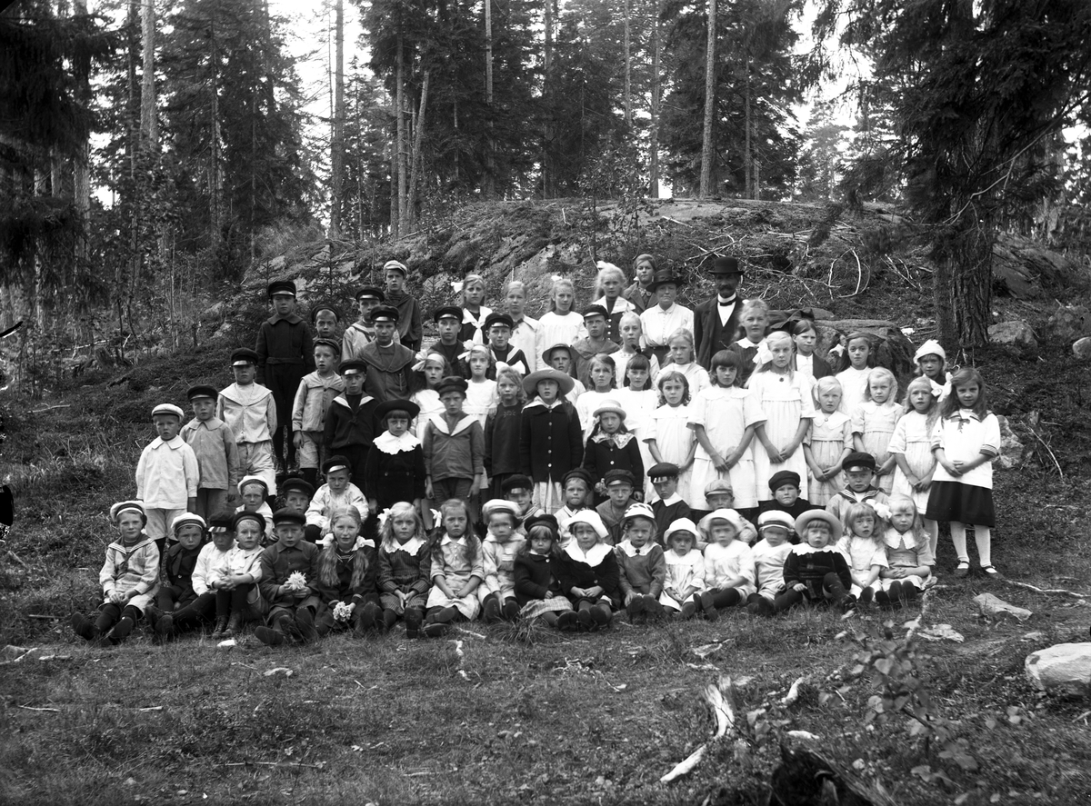 Lärare med en samling skolelever, troligtvis på utflykt i skogen.