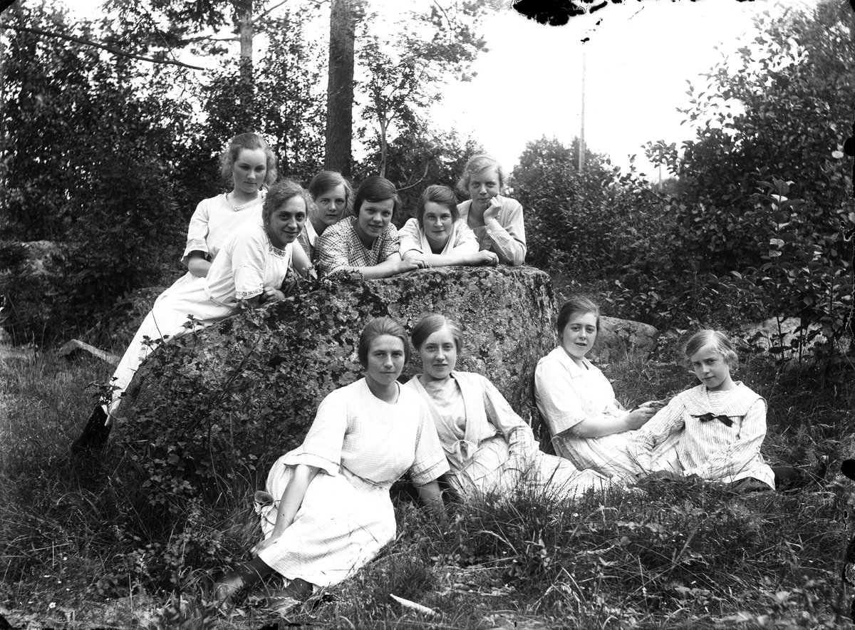 Tio flickor i naturen.