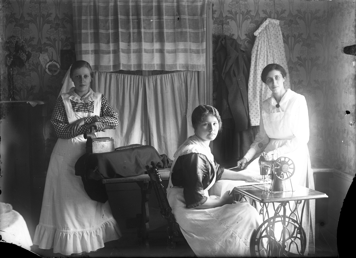 Tre kvinnor i en syateljé. Foto 1910-talet. Kvinnorna är Alma Lundgren-Åsbrink, Anna Olsson född Sundin, Råhällan och Karin Bergkvist-Hedvall.