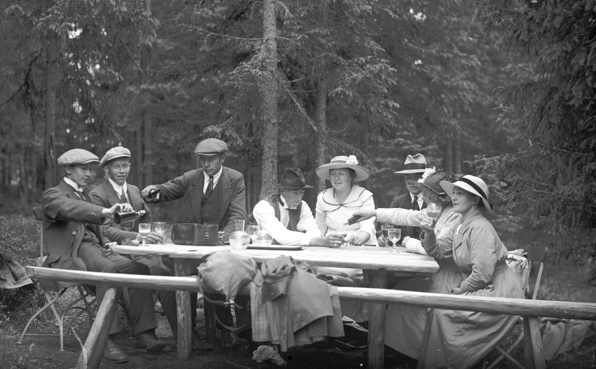 Utflykt. Josef Eriksson bjuder på dricka. Damen till vänster Josefs syster Betty, Wästra Hästbo. Mannen till höger Enok Eriksson, Åsmundshyttan.