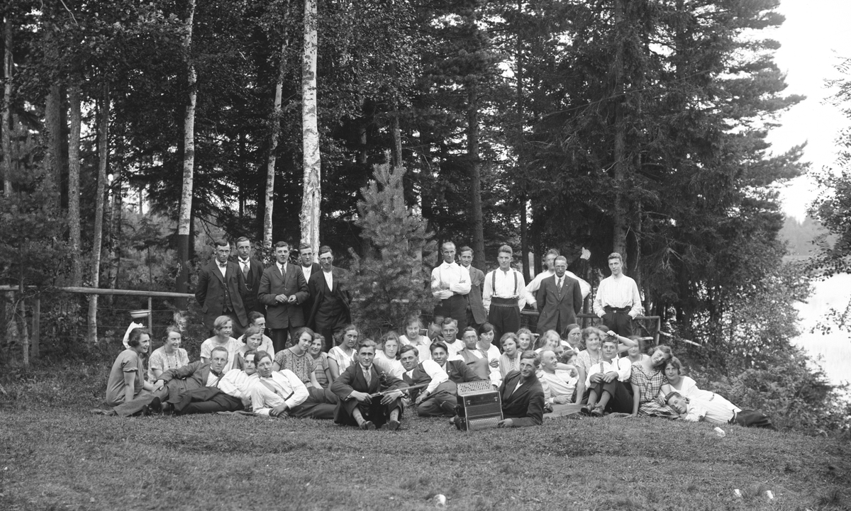 Vid Nyhytte Dammsjön där ungdomarna höll till och dansade. Fjärde mannen längst fram från vänster Gustav Englund, Prästhyttan. Bredvid Enok Eriksson, Åsmundshyttan.