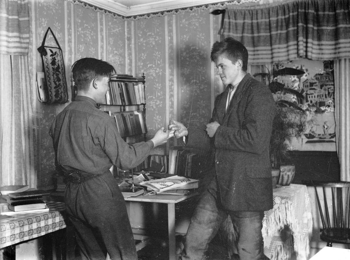 Joel Hansson och Arnold Jönsson provar sin styrka i fingerkrok. Observera den vackra tapeten och den målade rullgardinen.